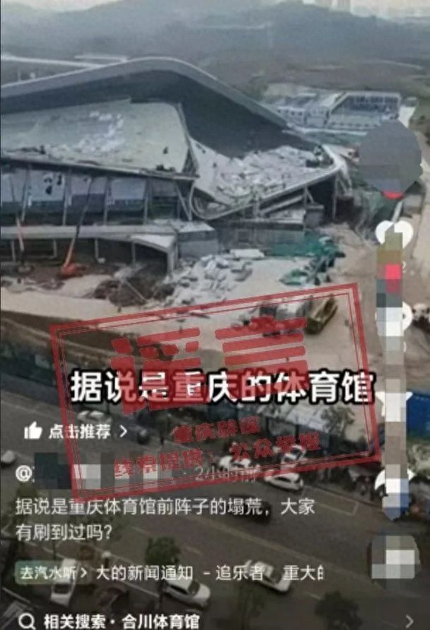 “重慶辟謠”調查發現,關于“重慶體育館坍塌”的謠言最早出現在2023年9月,某網民發布信息稱“重慶合川區新建體育館坍塌了”。評論區有網民指出該信息內容不實,并譴責網民造謠,屬地相關部門也對此進行過辟謠。網民為博取關注、吸引流量將“老謠”翻炒,故意編造“重慶體育館坍塌”謠言。目前,警方正對造謠網民展開調查。