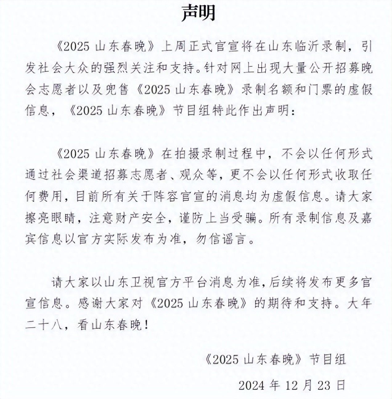 針對網(wǎng)上出現(xiàn)大量公開招募晚會志愿者以及兜售《2025山東春晚》錄制名額和門票的虛假信息,《2025山東春晚》節(jié)目組特此作出聲明。