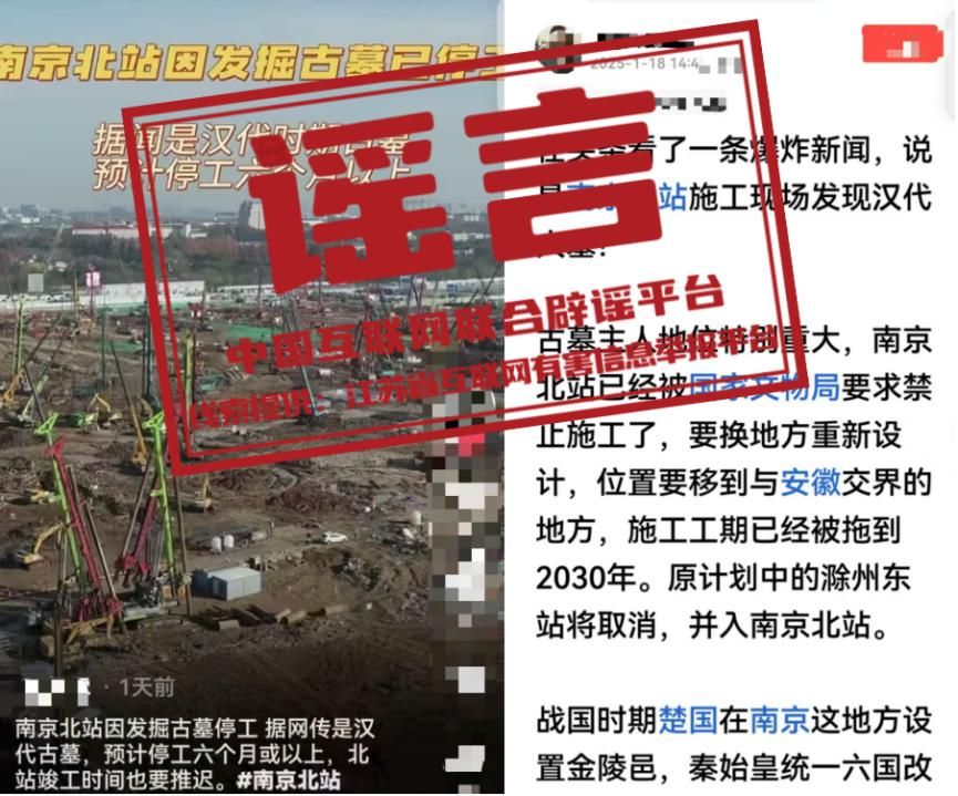 真相:近日,有網民在網絡平臺發帖稱,南京北站因挖到古墓,“已經被國家文物局要求禁止施工了”“預計停工六個月或以上”“施工工期已經被拖到2030年”等。經江蘇省互聯網辟謠平臺與省文物部門和屬地核實,目前沒有收到國家文物局關于“南京北站禁止施工”的有關通知,南京北站除個別涉及考古發掘作業區域外,其他施工作業均按計劃正常有序推進,網傳信息系謠言。(來源:江蘇省互聯網辟謠平臺、“南京網絡辟謠”微信公眾號)