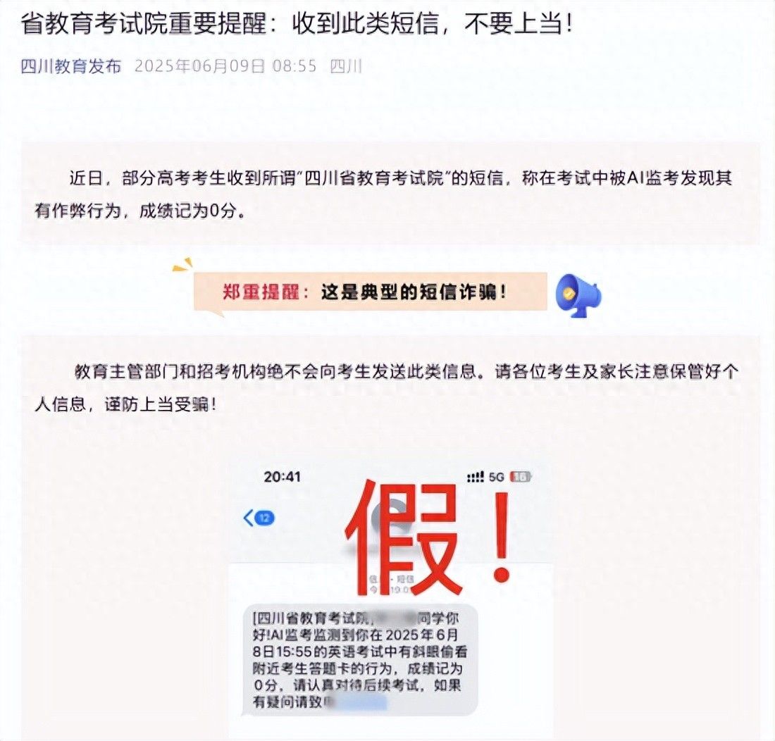 各地提醒,請各位考生及家長注意保管好個(gè)人信息,收到可疑短信,切勿輕信,不點(diǎn)擊鏈接、不回?fù)茈娫挕⒉煌嘎缎畔ⅰ⒉换貜?fù)、不轉(zhuǎn)賬;有疑問通過官方渠道核實(shí),遭遇詐騙立即報(bào)警。謹(jǐn)防上當(dāng)受騙!