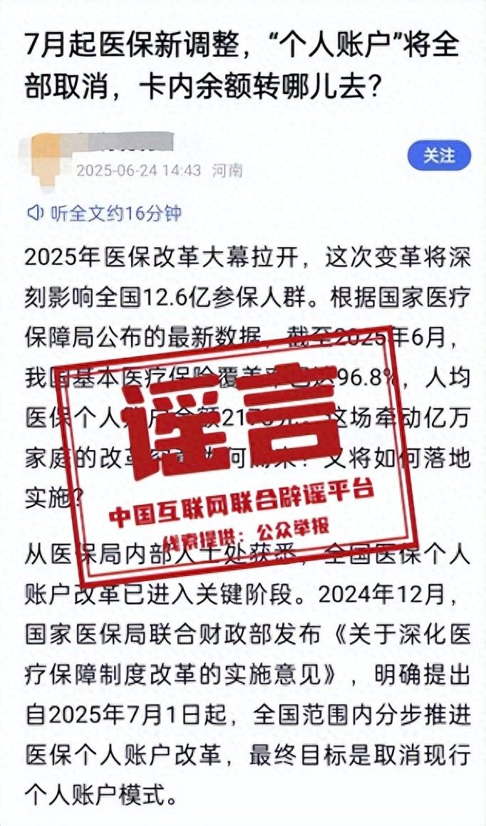 近日,一篇題為《7月起醫(yī)保新調(diào)整,“個(gè)人賬戶”將全部取消,卡內(nèi)余額轉(zhuǎn)哪里去?》的自媒體文章引起較多關(guān)注。文中宣稱“從醫(yī)保局內(nèi)部人士處獲悉,全國(guó)醫(yī)保個(gè)人賬戶改革已進(jìn)入關(guān)鍵階段。2024年12月,國(guó)家醫(yī)保局聯(lián)合財(cái)政部發(fā)布《關(guān)于深化醫(yī)療保障制度改革的實(shí)施意見(jiàn)》,明確提出自2025年7月1日起,全國(guó)范圍內(nèi)分步推進(jìn)醫(yī)保個(gè)人賬戶改革,最終目標(biāo)是取消現(xiàn)行個(gè)人賬戶模式”。隨后,不少自媒體也發(fā)布了類似內(nèi)容。